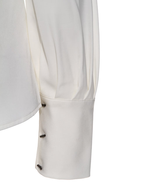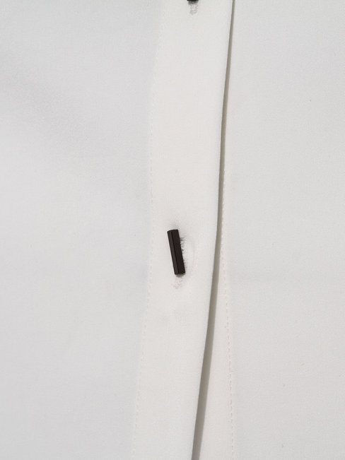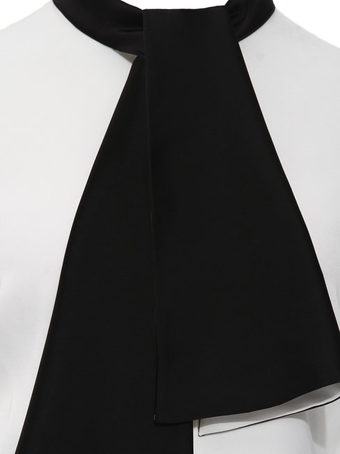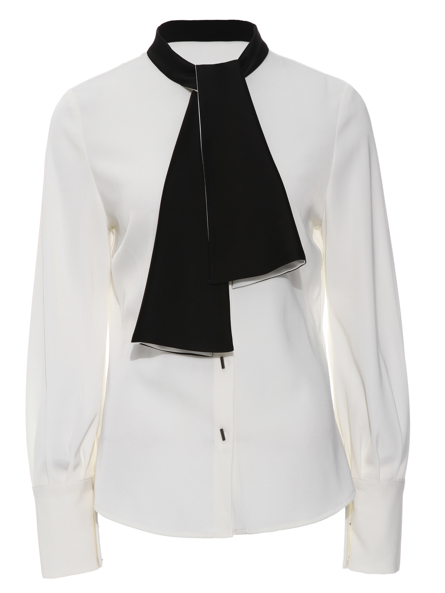 It's a stylish shirt! The black stand collar with scarf like design look chic! The cloth's good and all the details are fine! Can wear it casual or in the office, very useful!