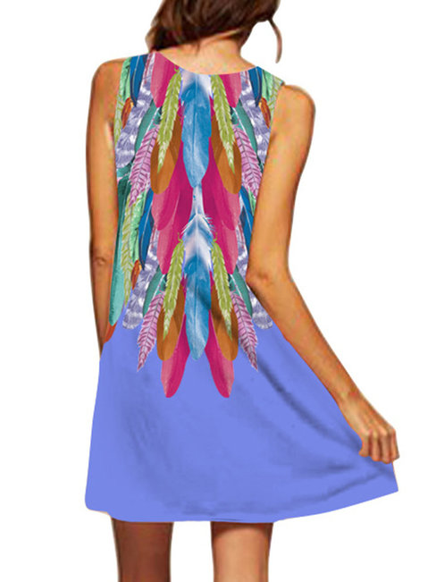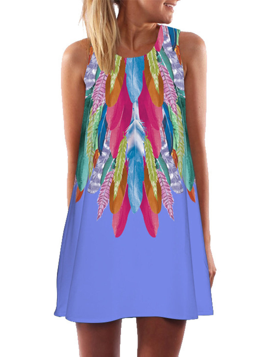 Purple Straight Round Neck Feather Pattern Polyester Casual Dresses (Style V100192)