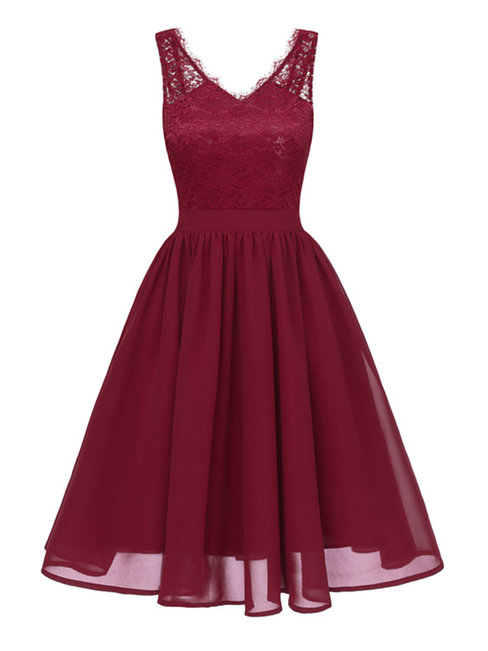 Burgundy Trumpet V-neck Backless Knee Length Dresses (Style V200597)
