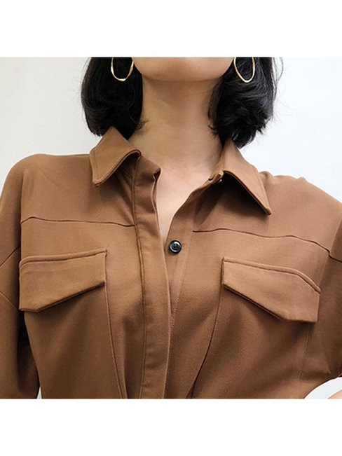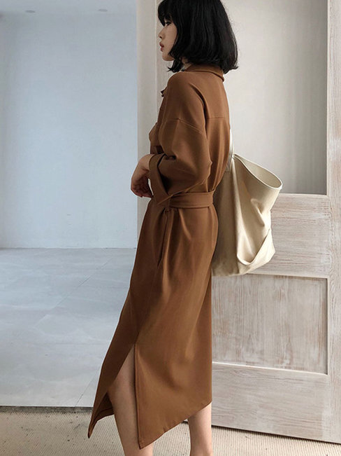 - Coffee Tunic Shawl Collar Solid Color Sash Dacron Midi Dresses (Style V201884)