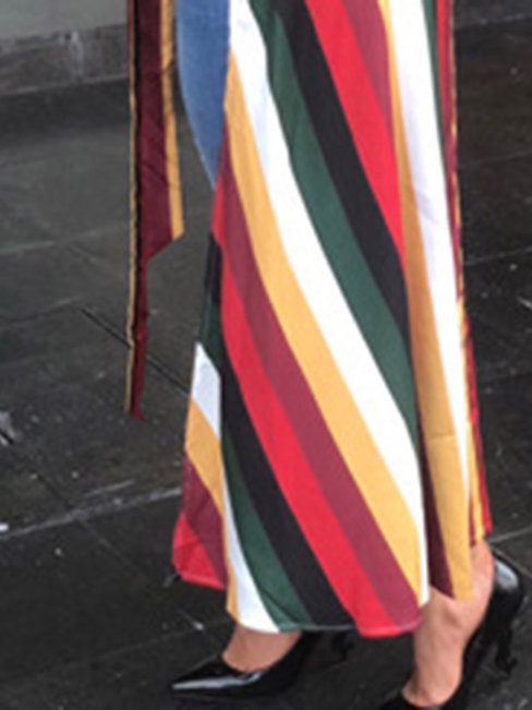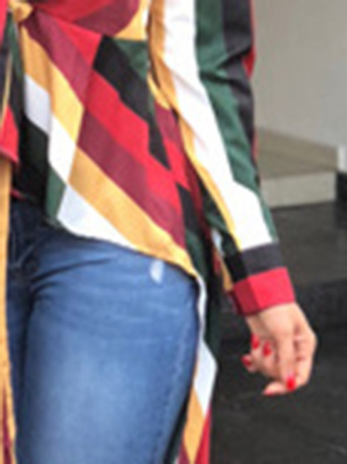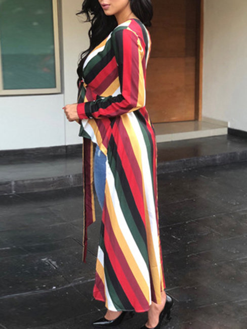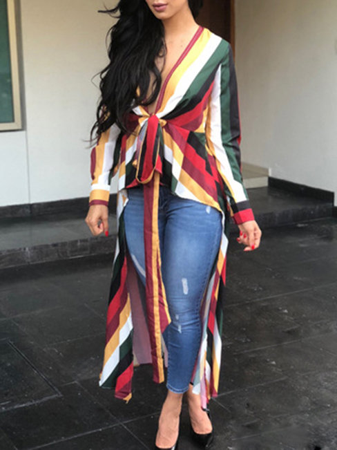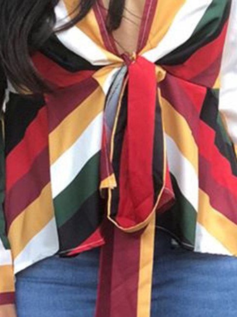 - Burgundy V-neck Casual Striped Polyester Asymmetrical Blouse (Style V201375)
