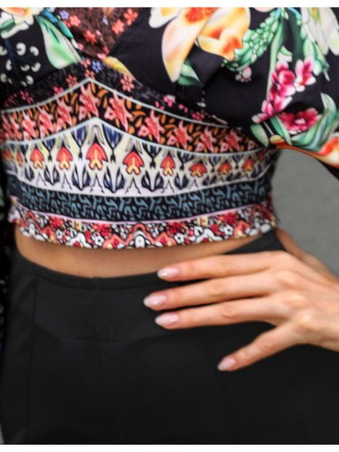 - Black V-neck Short Slim Floral Pattern Blouse (Style V300391)