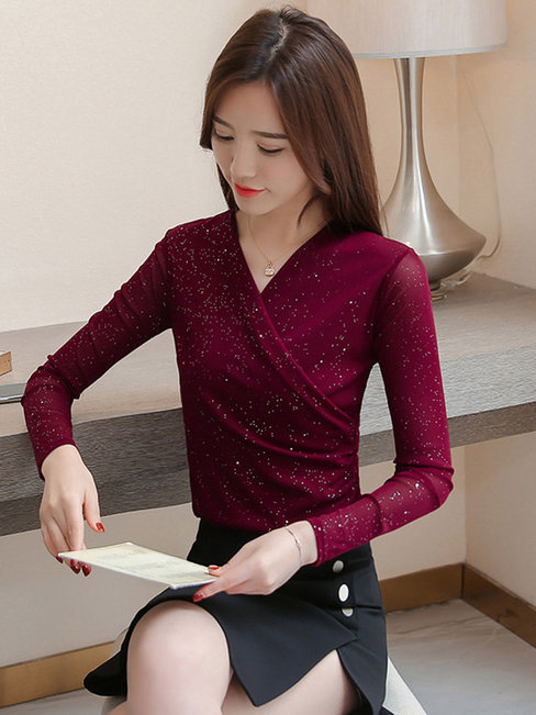 - Burgundy V-neck Slim Office Plain Polyester Blouse (Style V201937)