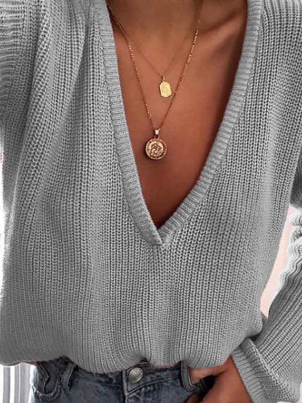 Light Gray V-neck Standard Casual Plain Acrylic Sweater (Style V101089)