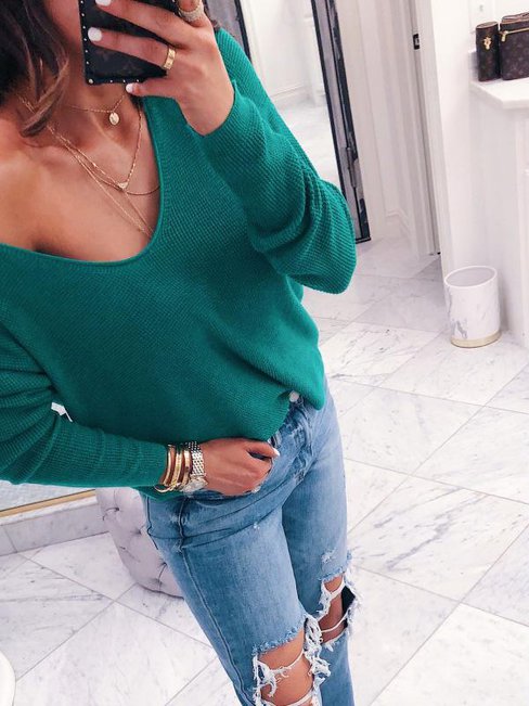 - Brown V-neck Standard Loose Casual Polyester Sweater (Style V101092)