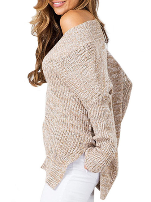 The big V neck and loose design looks fabulous, you can wear it in a normal way, or as the photos, one shoulder off, both looks very stylish! The plain knitting's simple and the quality's great! Love this one!
