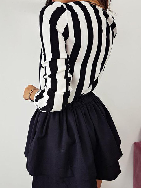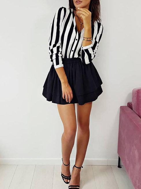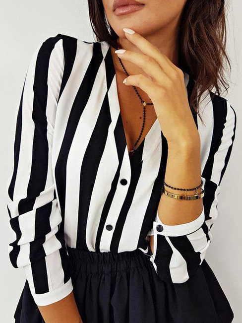 - Black V-neck Standard Striped Polyester Button Blouse (Style V300858)