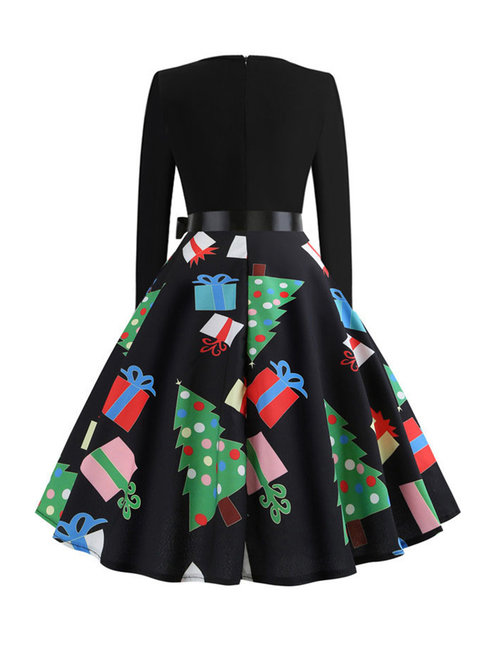 Black Vintage Trumpet Round Neck Patchwork Satin Knee Length Dresses (Style V201159)