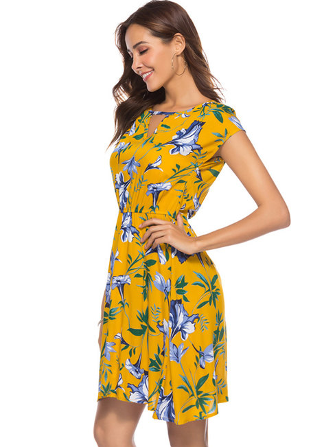 - Light Blue Western A-line Round Neck Floral Print Mini Dresses (Style V200641)
