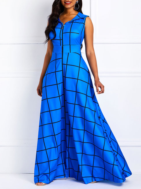 - Blue Western Expansion V-neck Plaid Zipper Maxi Dresses (Style V200851)