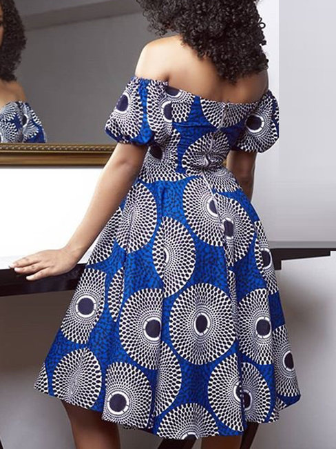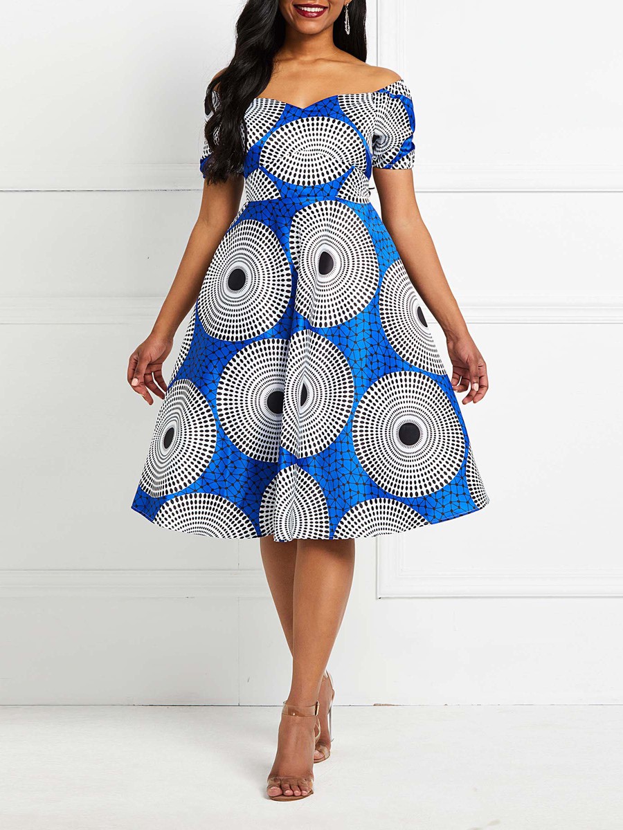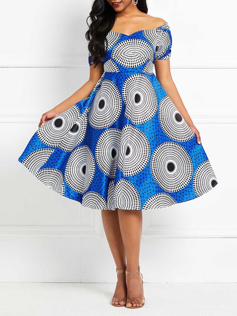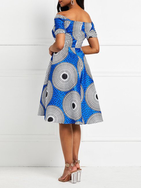 - Dark Blue Western Off The Shoulder Geometric Print Satin Midi Dresses (Style V201541)